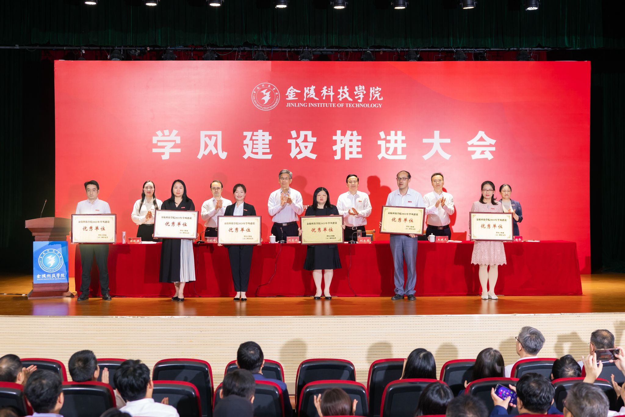 会上,与会领导为2023年学风建设优秀单位颁奖。教务处、学生工作处、商学院、园艺园林学院,以及建筑工程学院教师代表、软件工程学院学生代表分别作交流。