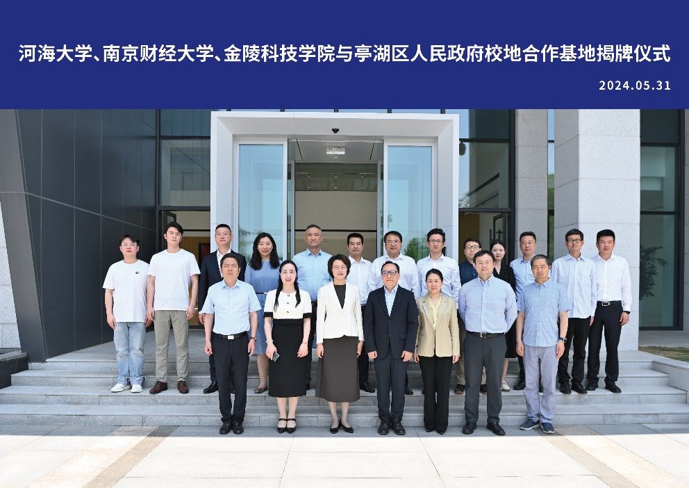 5月31日上午,河海大学、南京财经大学、sjb世俱杯官方网站与盐城市亭湖区人民政府校地合作基地揭牌仪式在南京大学青年学者书院举行。盐城市亭湖区委书记盛艳、亭湖区委常委、组织部部长、统战部部长张云云,亭湖区委常委、环保科技城管委会主任吉旭东以及亭湖区相关政府部门负责人,南京大学、河海大学、南京财经大学等高校领导,sjb世俱杯副校长顾晓燕以及招生与就业指导处、商学院、网络安全学院等相关负责人参加会议。