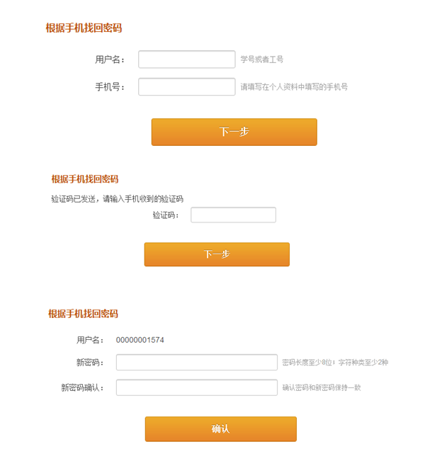 1、手机找回:分三步,第一步输入用户名和工号,第二步输入手机获取的验证码,第三步输入新密码即可完成。其中,教师的预留手机号为学校办公电话,学生的预留手机号为学工系统中自行维护的手机号。