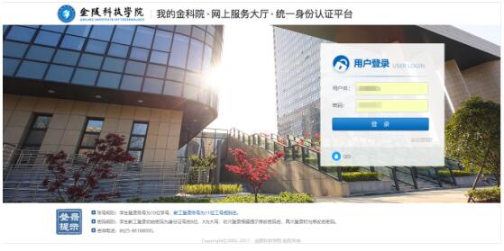 在浏览器地址栏输入学校域名/_mediafile/jlkj/,点击 “我的金科院”进入网上服务大厅,输入用户名和密码点击登录。