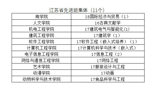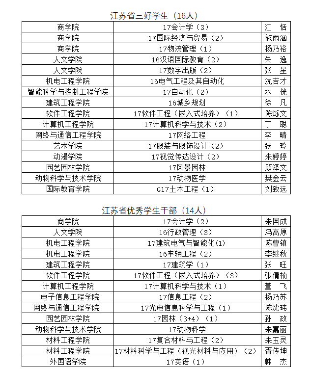 根据《省教育厅团省委关于评选2020年度江苏省普通高校省级三好学生、优秀学生干部和先进班集体的通知》(苏教学〔2020〕2号)文件的要求,经各学院推荐,学生工作委员会评选,拟决定推荐18国际经济与贸易(1)等11个班级为省级先进班集体,江恬等30名学生为省三好学生和优秀学生干部,现将名单公示如下。