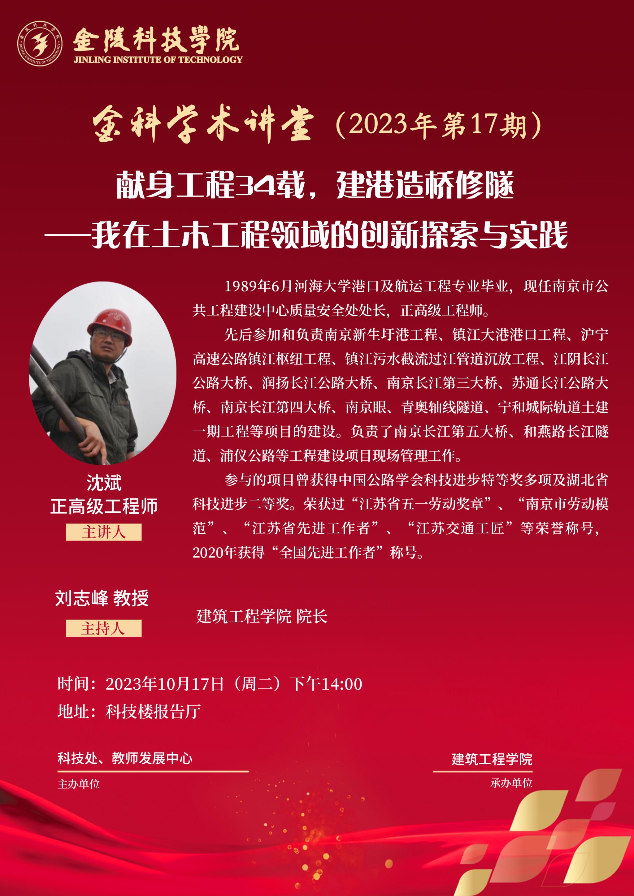 关于举办线下“金科学术讲堂:献身工程34载,建港造桥修隧——我在土木工程领域的创新探索与实践”学术报告的通知