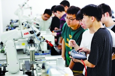 学生在ABB校企合作工业机器人应用创新中心做实验。