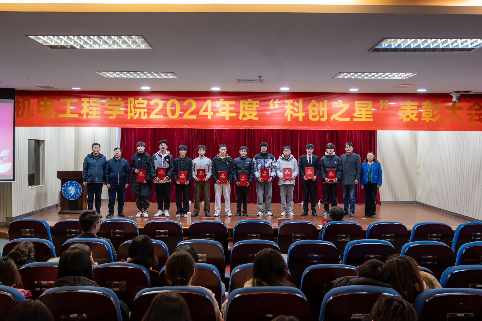 12月25日,机电工程学院2024年度“科创之星”表彰大会在图书馆第二报告厅隆重举行,大会旨在表彰2024年度在科创竞赛中表现优异的学生,进一步激发全院师生科技创新的积极性。院长周金宇、院党委副书记张蓉、副院长于继明、副院长刘祥建、教授邹政耀以及部分师生代表参加了此次大会。