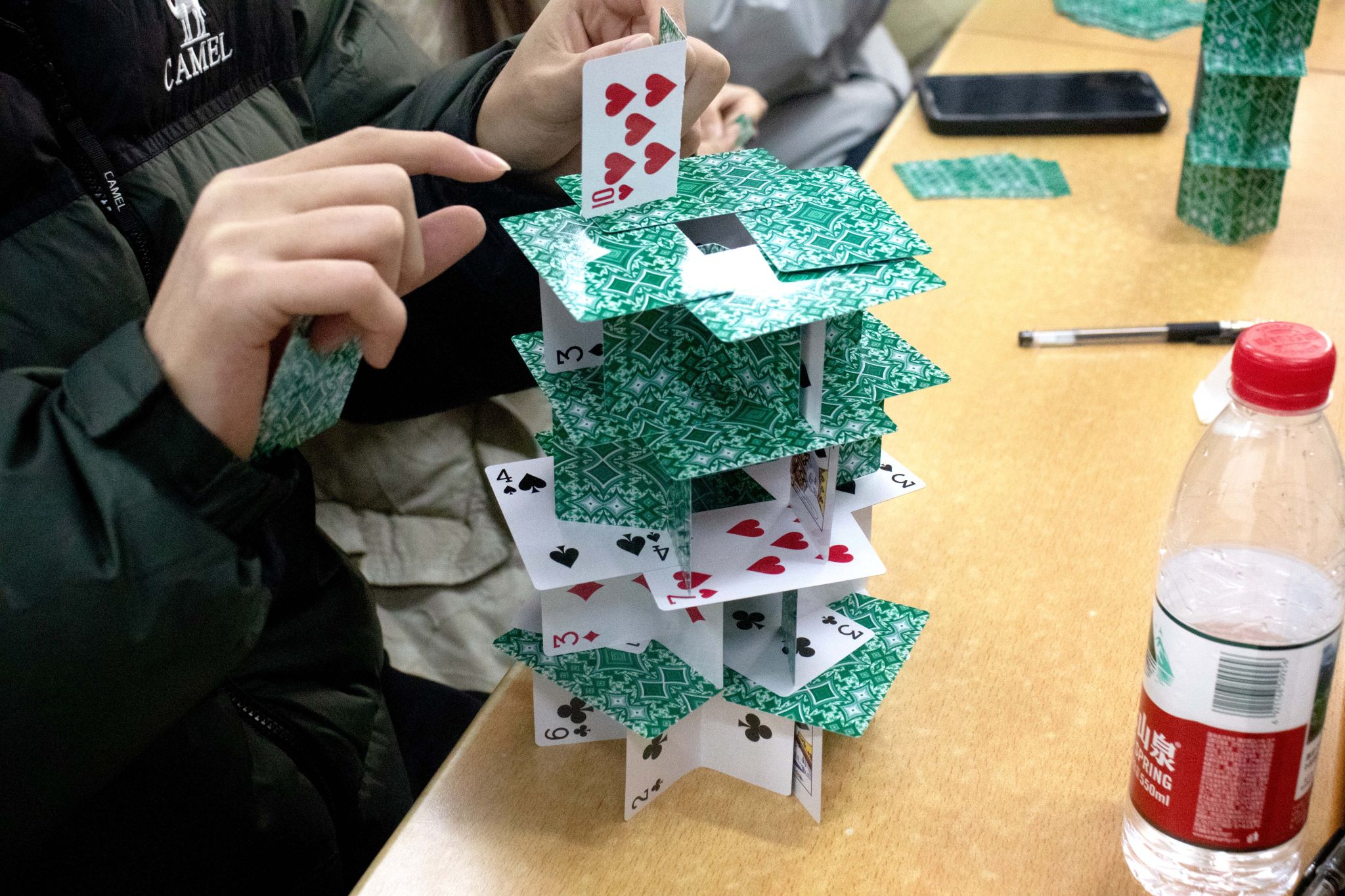 活动伊始,同学们依次进行自我介绍,青涩的笑容、真诚的言语,瞬间打破了彼此之间的陌生隔阂,整个会场充满了欢声笑语,气氛逐渐升温。“放飞烦恼”环节是本次活动的一大亮点。同学们拿起笔,将内心深处的压力与烦恼细细写在纸上,随后轻轻放飞,看着那承载着困扰的纸张随风飘远,仿佛那些无形的压力也随之飘散于天际。这一环节不仅是一次心灵的减负行动,更是对同学们情感的一种释放和慰藉。而最激动人心的当属“扑克牌搭高楼”比赛,每组同学围坐在一起,大家齐心协力、争分夺秒,小心翼翼地摆弄着扑克牌,眼神中透露出坚定与专注,在有限的时间内挑战极限高度。这一环节不仅锻炼了同学们的动手能力和团队协作能力,更在轻松愉快的氛围中进一步加深了彼此之间的情谊。