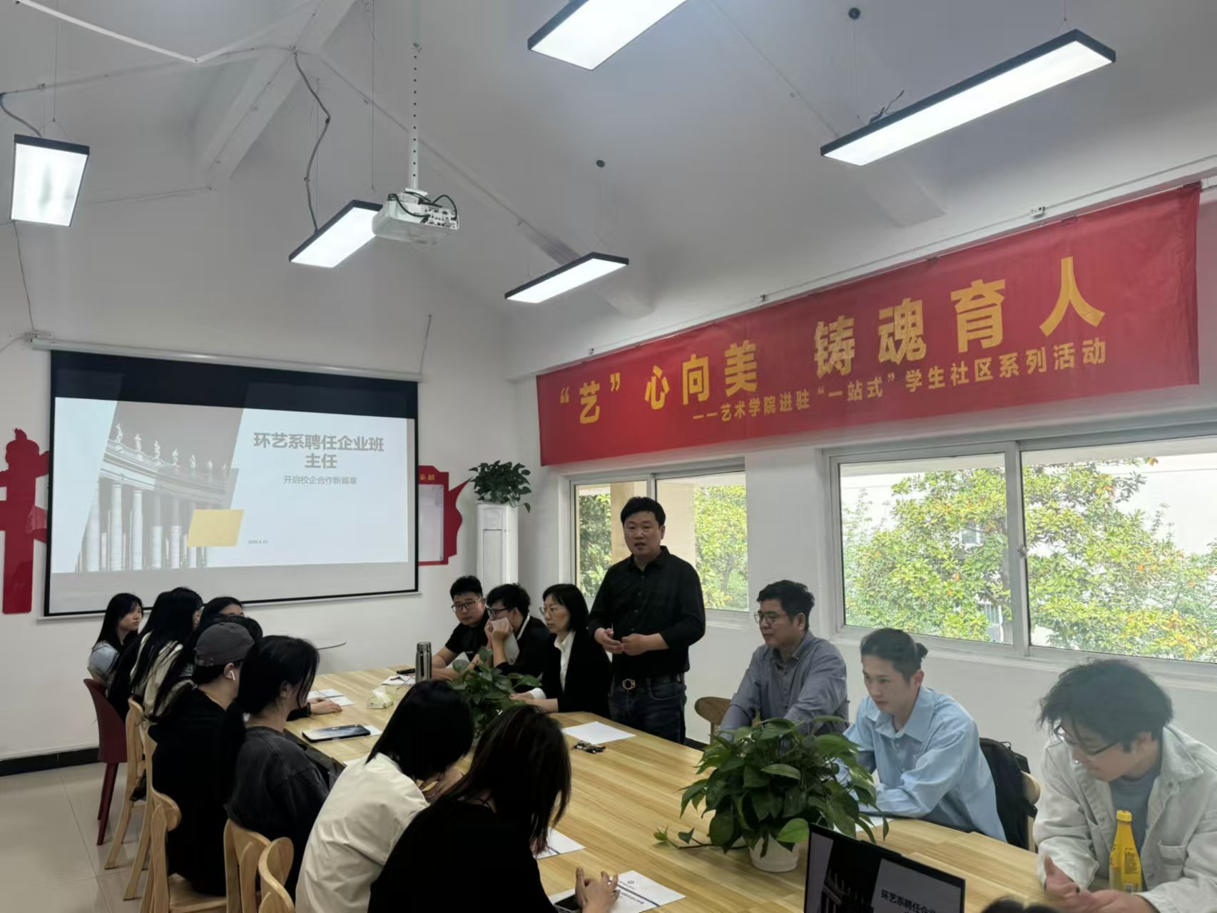 4月23日,艺术学院于南07学生一站式社区举行企业班主任聘任仪式暨访企拓岗专项行动。艺术学院副院长黄向群,环境设计系主任徐晶、副主任王玲燕,2016届校友、无形树景观设计公司创始人曹传龙以及23级环境设计班全体同学参加活动。