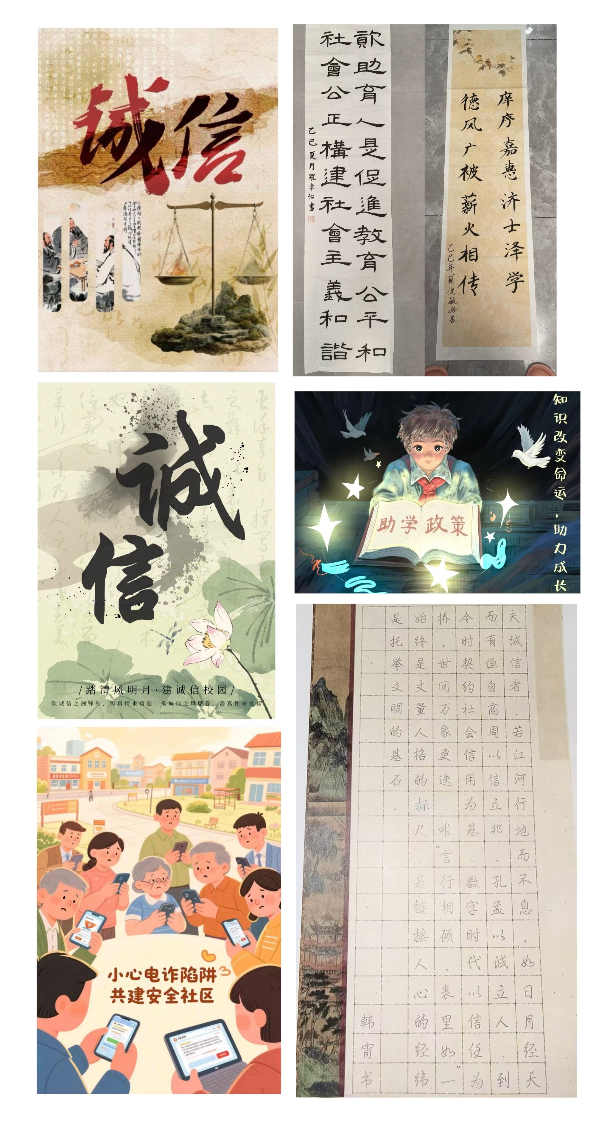 2025年5月-6月,艺术学院成功举办学生资助诚信教育主题系列活动,通过知识竞赛、主题征文、线上答题、反诈讲座、艺术创作等多元形式,将诚信教育、感恩励志教育与艺术专业特色深度融合。