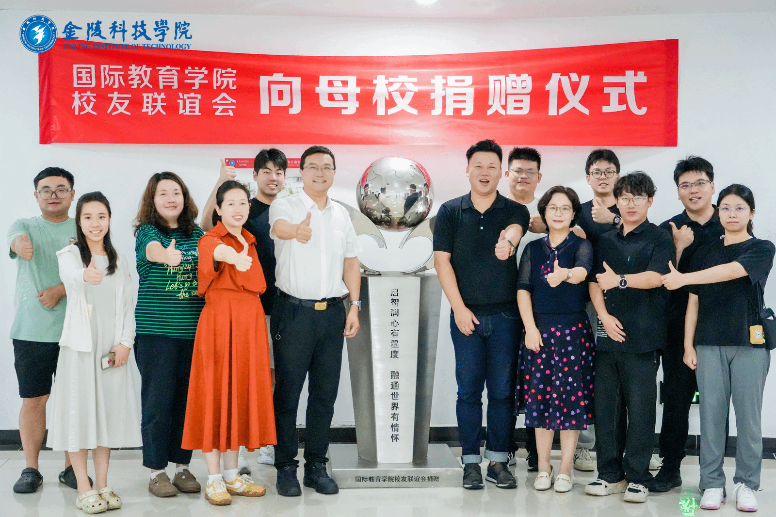座谈会后,学院校友联谊会会长杨涛代表广大校友向母校捐赠了一座高1.8米的铁铸地球模型。该模型以精密工艺铸造,镌刻着“启智润心有温度,融通世界有情怀”的院训铭文。地球模型不仅象征着学院培养具有全球胜任力人才的办学理念,更寄托着校友们对学院强化国际化人才培养的殷切期望。