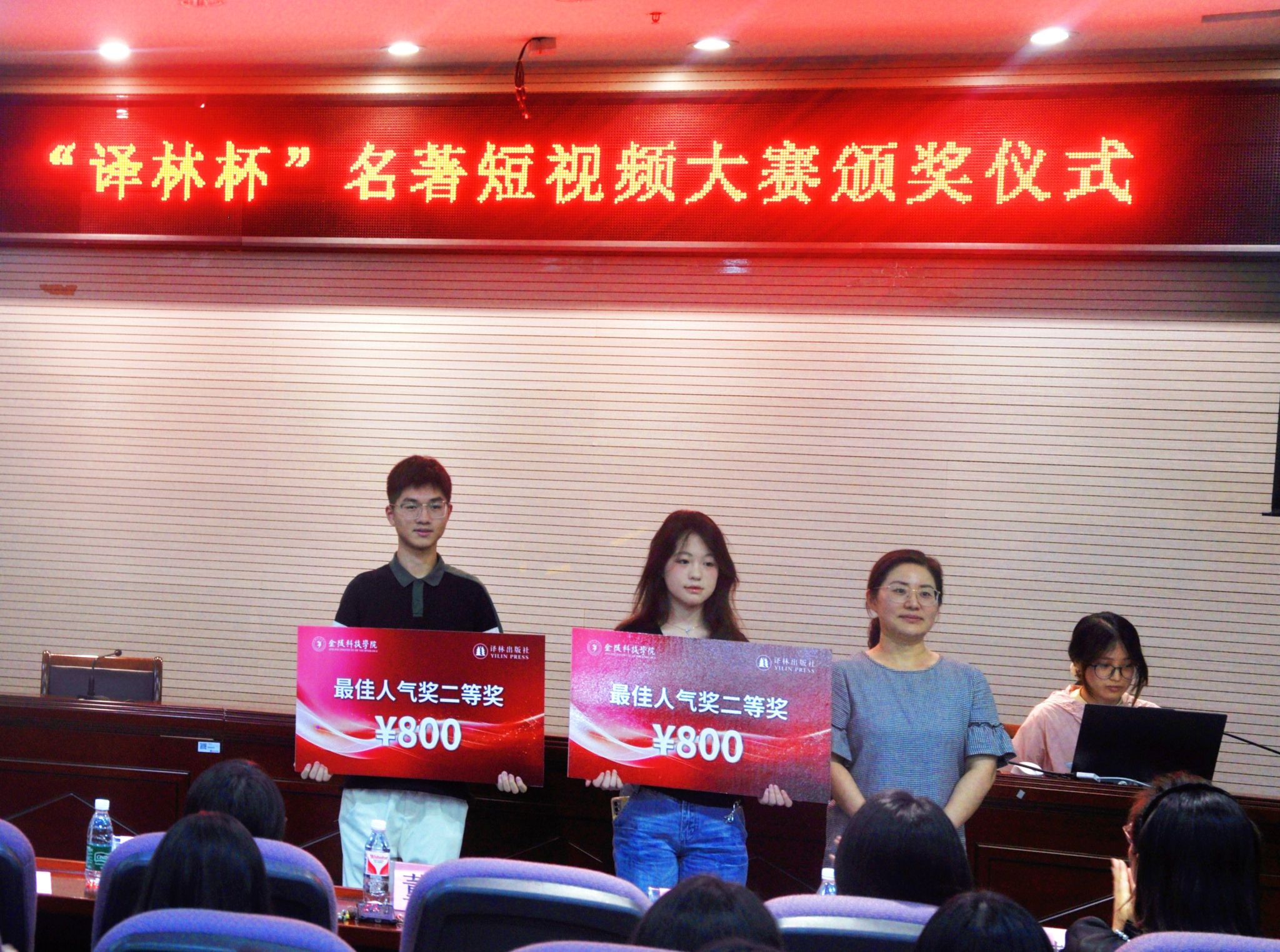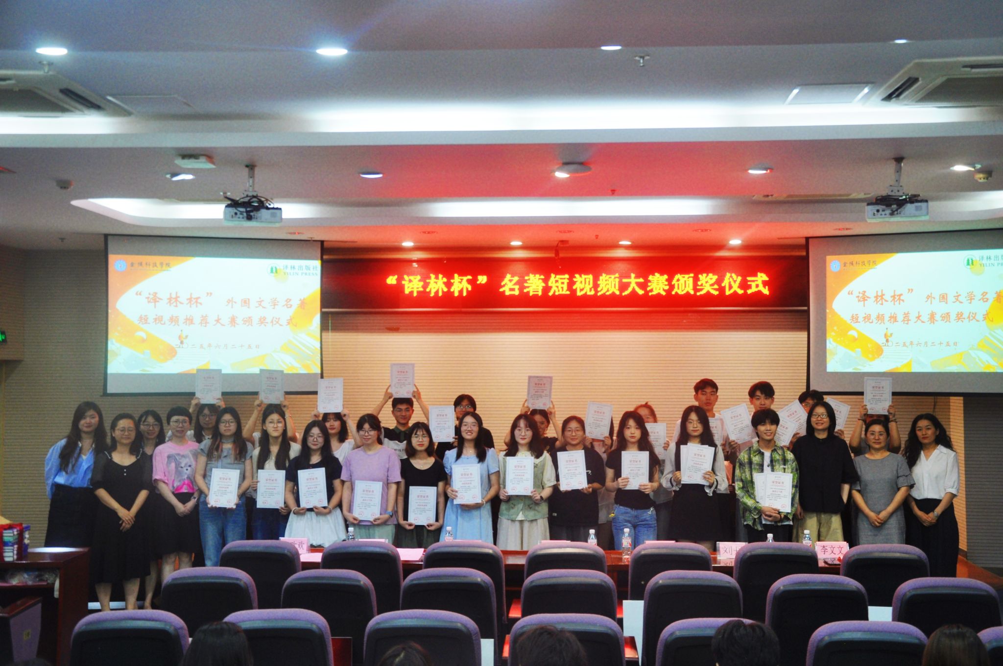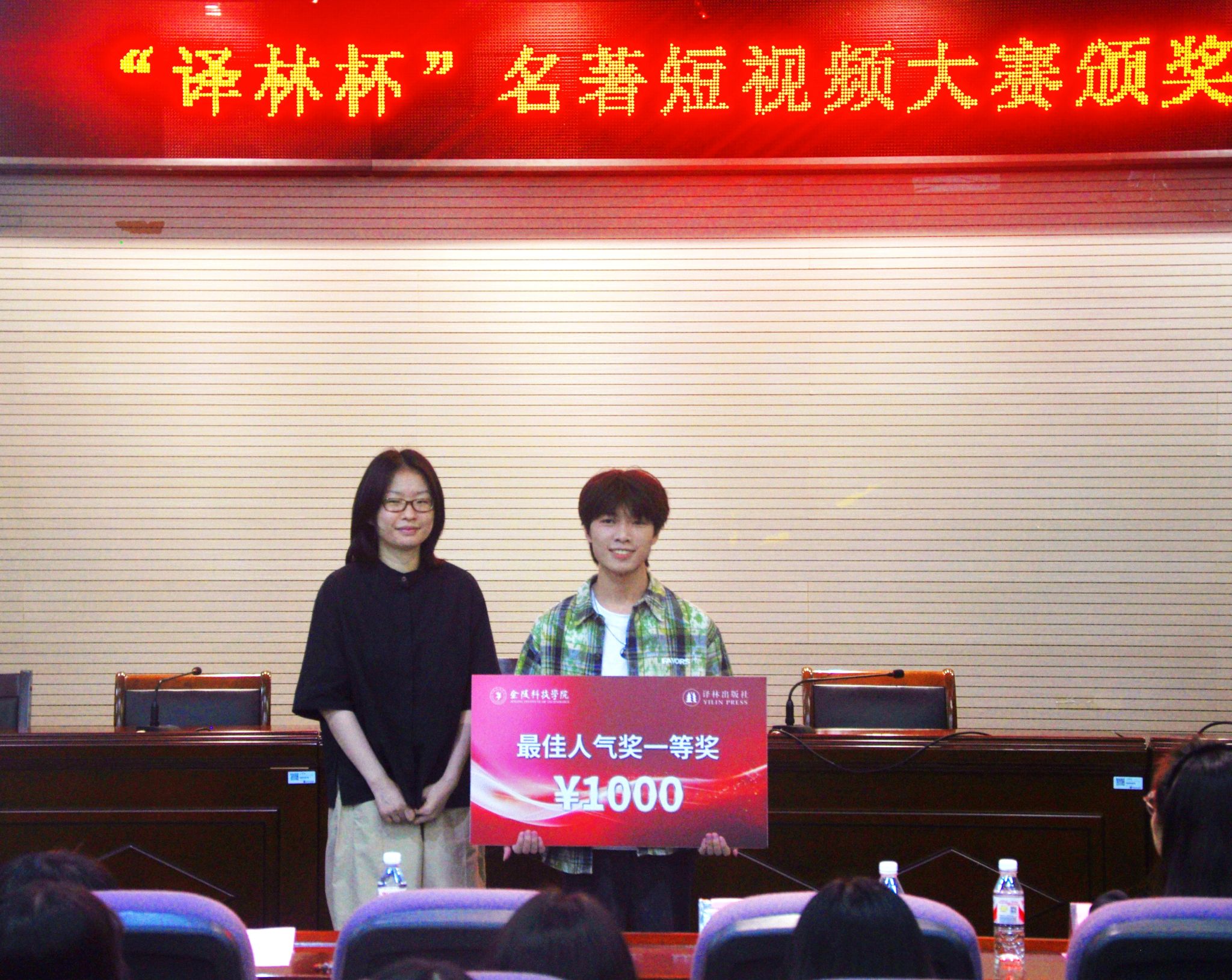 活动伊始,观众们跟随参赛视频集锦回顾了整个大赛创作历程,全场沉浸式走进了这场文学创意之旅。从春日启动的期待,到作品征集时的踊跃,再到评选阶段的激烈,镜头里藏着学子们与外国名著对话的热忱。王倩倩老师介绍了本次大赛的初衷和意义:鼓励同学们以短视频为桥,打破经典传播壁垒,以青春视角解码名著。随后,译林出版社张主任精彩致辞,肯定了本次大赛中涌现出的优质作品,大赛是一次与学校、与大学生的深度联动。借短视频的形式让经典“潮”起来,让名著不再是书架上的“沉默文字”,而是在青春创意里“活”成新故事,为经典传播探索了新路子。