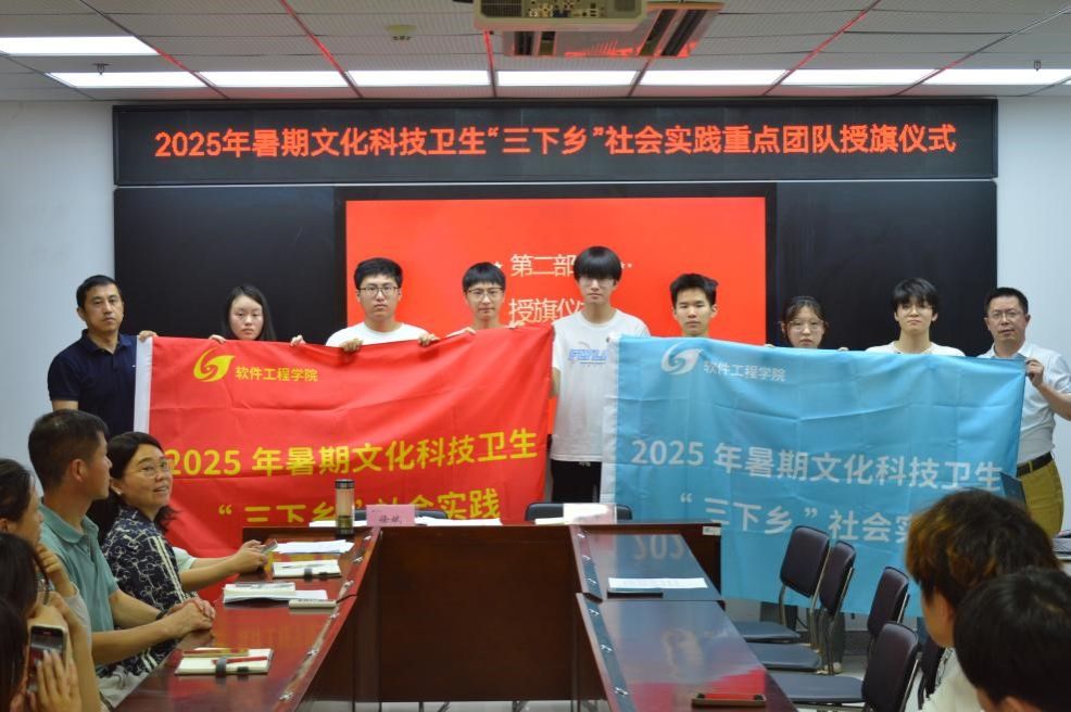 为认真学习贯彻习近平新时代中国特色社会主义思想,全面贯彻党的二十大和二十届二中、三中全会精神,深化落实习近平总书记关于青年工作的重要思想,引导青年学生上好“行走的思政课”,软件工程学院于7月4日在科技楼2-423会议室隆重举行2025年暑期文化科技卫生“三下乡”社会实践重点团队授旗仪式。学院党委书记戴军、党委副书记徐斌及全体辅导员出席仪式,各实践团队学生代表参加活动。仪式由院团总支副书记张议允主持。