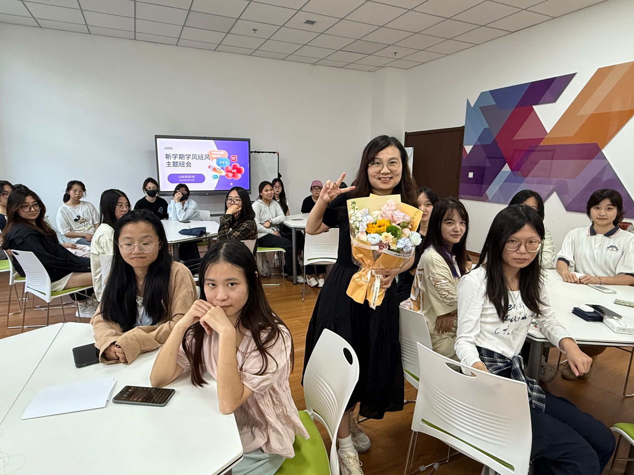 上课铃还未敲响,教室里就已经弥漫着期待与兴奋。伴随着熟悉的脚步声,英语系的老师们走进教室,同学们齐刷刷地站起身来,用最响亮、最真诚的声音送上节日的祝福:“老师,教师节快乐!”。