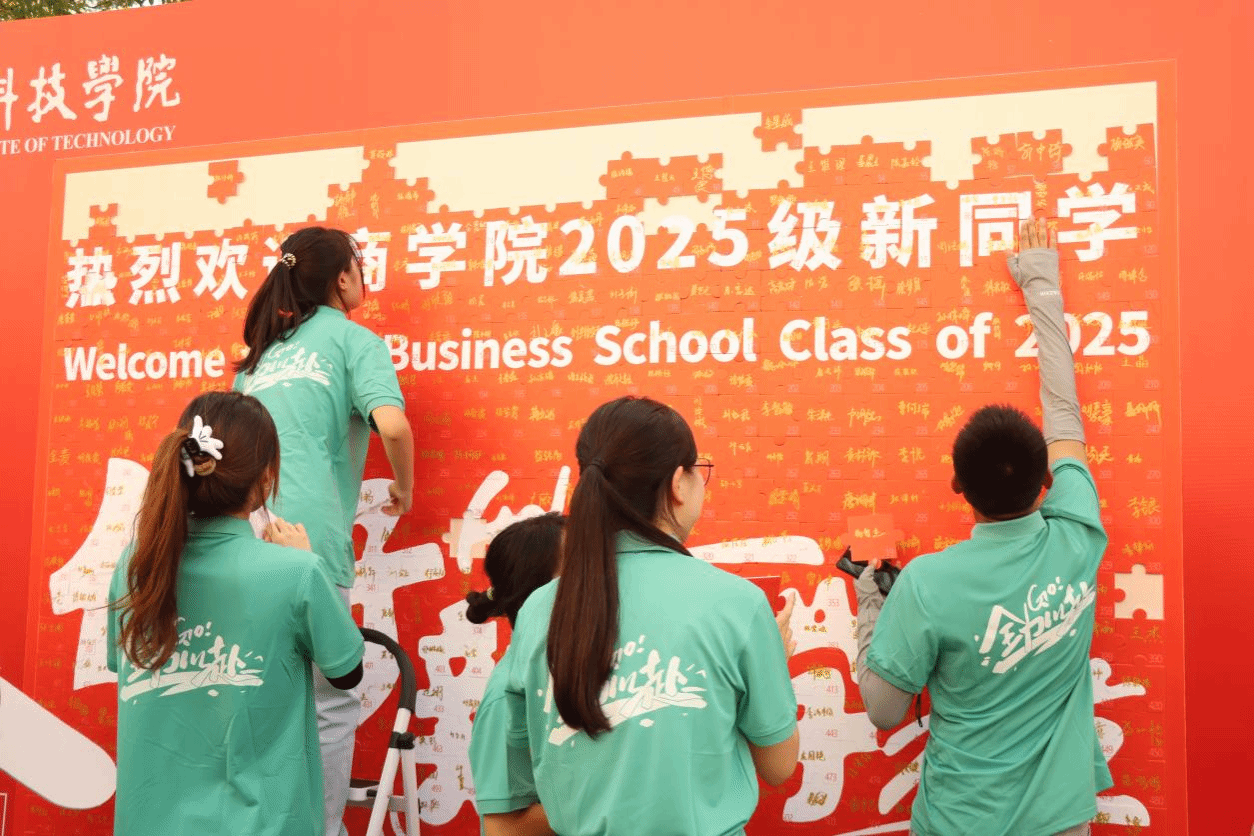 迎新当天,商学院迎新点秩序井然。新生辅导员、班主任、新生班助以及学生会志愿者严格按流程为新生高效办理注册手续,确保信息登记无误;同时分发精心筹备的“迎新大礼包”,内含学习用品等实用物资,承载学院对新生的殷切期待。学生会志愿者主动引导新生完成报到流程,细致解答校园生活、专业学习相关疑问,以热情服务让新生快速感受商学院大家庭的温暖。商学院为每位新生准备专属拼图,新生签名后拼至拼图墙,寓意正式融入集体。