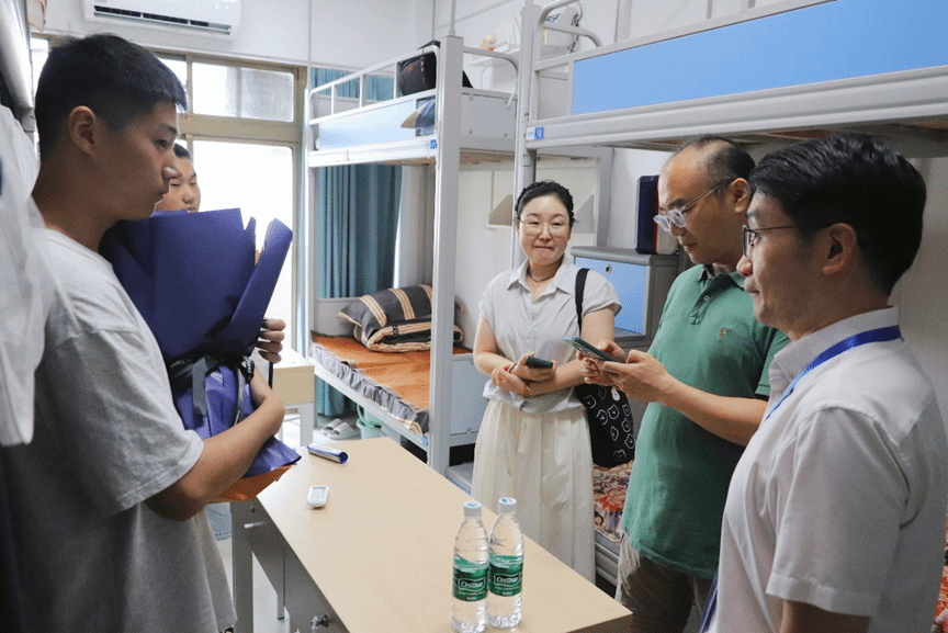 迎新期间,学院领导亲临现场迎接新生,与新生及家长亲切交流,用暖心关怀为初入校园的学子们送上 “第一份归属感”。与此同时,商学院党委副书记孙亮与新生辅导员、学生会主席一起专程前往学生宿舍,慰问今年考入商学院的状元同学。孙书记详细询问其报到情况与未来规划,鼓励其尽快适应大学生活,在专业学习中发挥优势,带动身边同学共同进步,为学院发展贡献力量。