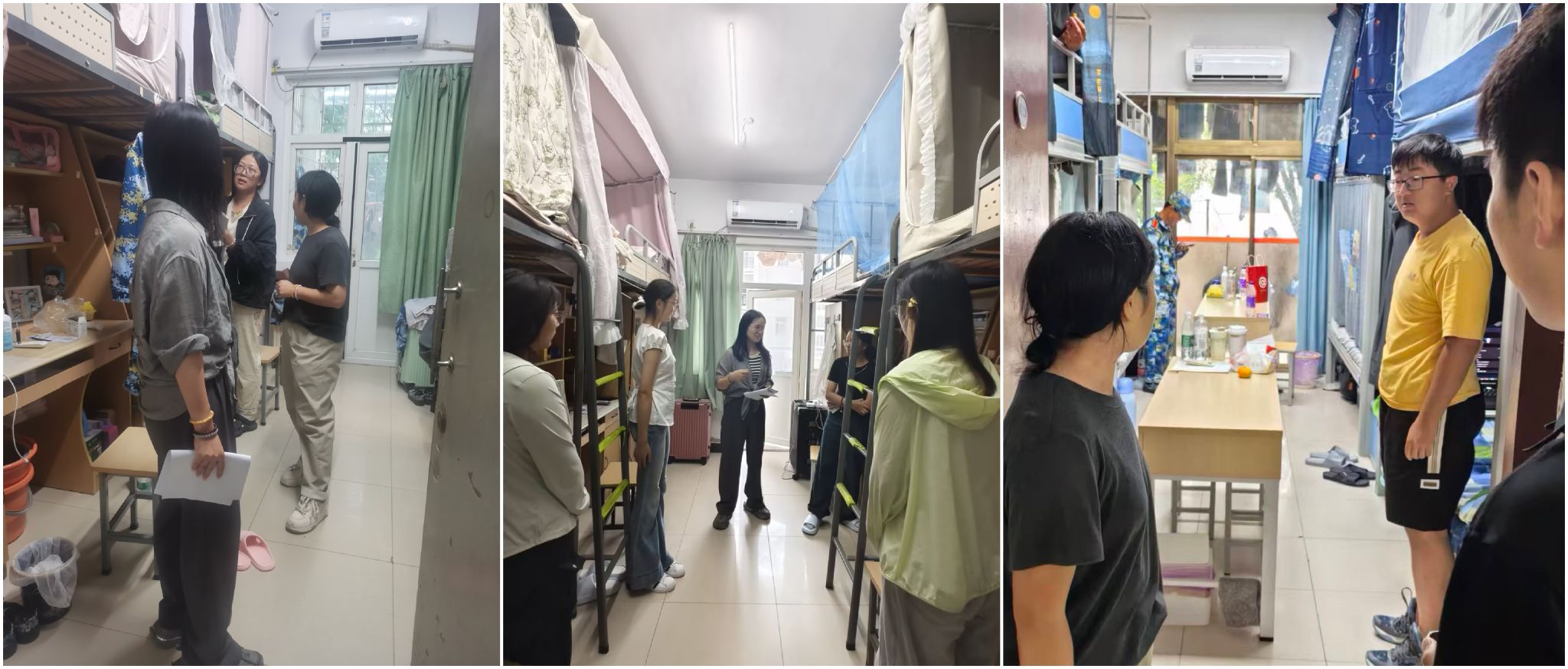 此次检查覆盖北区01栋、南区04栋两个新生住宿区域。新生辅导员鲁瑶、姜艳老师带领检查团队,严格对照军训内务规范标准,逐间查看宿舍地面清洁度、桌面物品摆放整齐度、床铺整理规范度,同时对阳台杂物收纳、公共大厅卫生维护等细节进行全面排查。检查过程中,老师们对内务整理达标、环境整洁有序的宿舍予以现场表扬,鼓励同学们继续保持良好习惯;对存在整理不规范、卫生死角的宿舍,则耐心指出问题并示范整改方法,引导新生理解内务整理背后“锤炼严谨作风、培养自律能力”的军训意义。