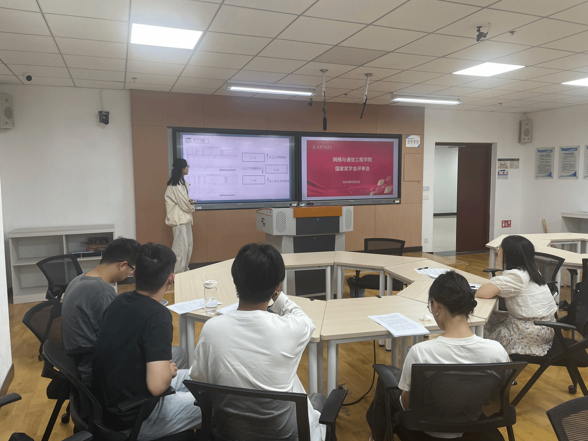 为激励学生勤奋学习、努力进取,在德、智、体、美、劳等方面全面发展,9月26日下午,网通学院在4号科技楼604智慧教室召开了2025年国家奖学金评审会,年级辅导员及学生代表参加了本次评审活动。
