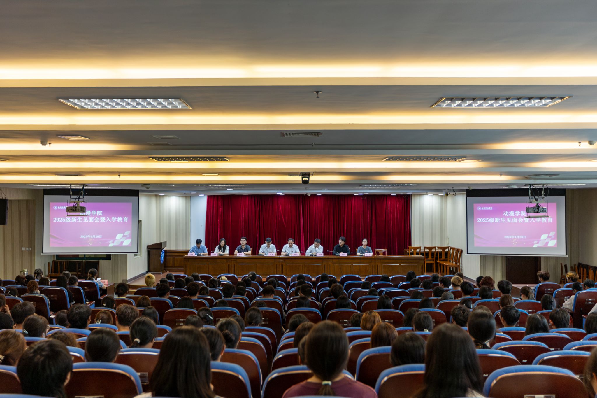 9月28日下午,动漫学院2025级本科新生见面会在图书馆第二报告厅隆重举行。学院党总支部书记葛维东、院长王贤波、副院长王柯、各系主任、全体辅导员、新生班主任与217名2025级统招、单招、专转本新生齐聚一堂,共同开启大学新征程。