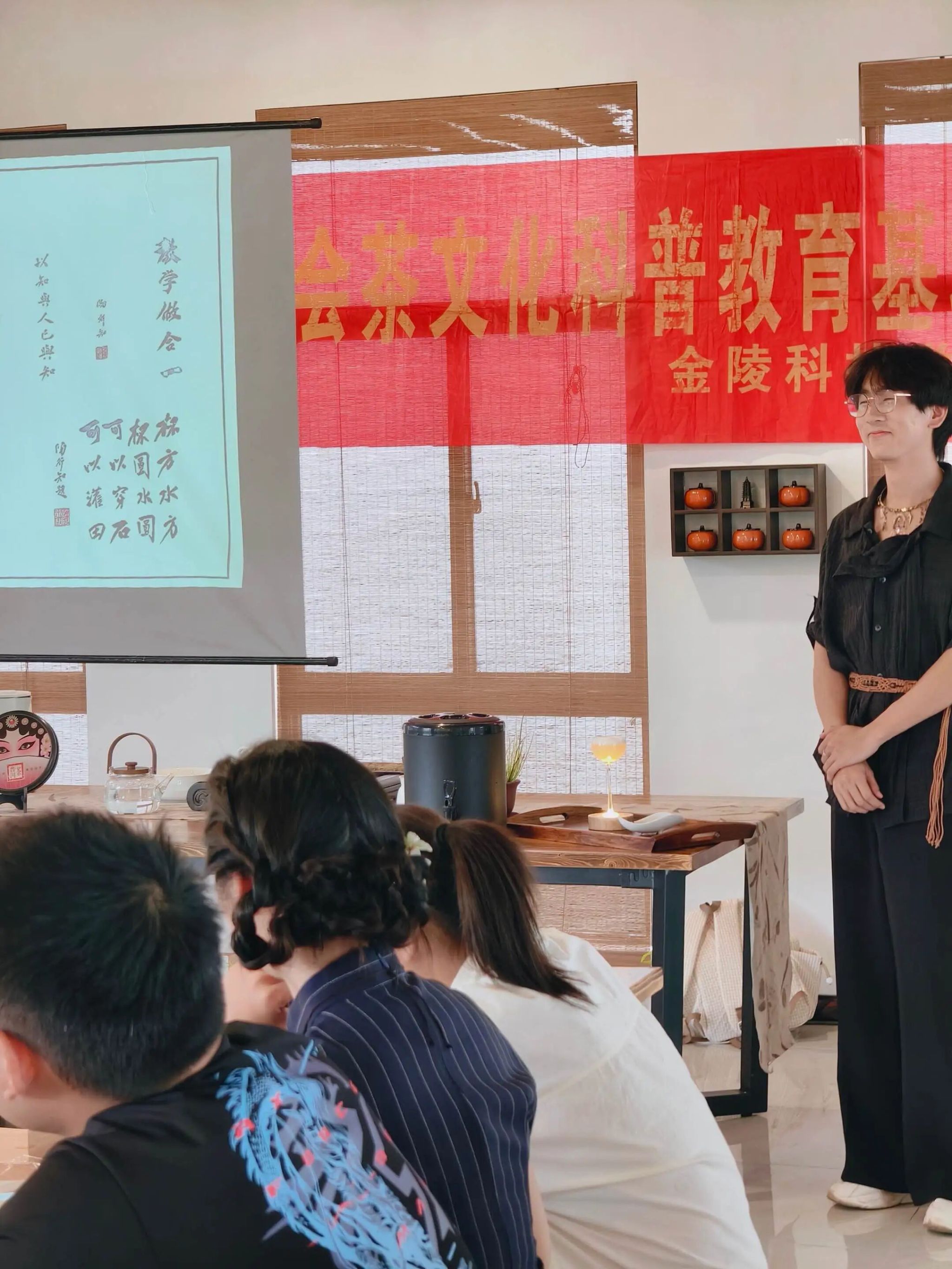 茶会伊始,茶团队教师带领师生共同追溯行知茶园的历史渊源。行知茶园是学校新建,其理念源自陶行知先生早年于晓庄学校的育人实践。陶先生曾将学校后方的茶园改造为“中心茶园”,使之不仅成为师生与乡邻品茶交流的场所,更成为践行“社会即学校”教育思想的重要阵地。当年悬挂的“嘻嘻哈哈喝茶,叽叽咕咕谈心”对联,生动映照出平等亲和、教学相融的氛围。如今,行知茶园正是对当年“中心茶园”的复建与延续,自规划建设之初即以“以茶载教”为核心理念,致力于打造一个融合文化传承与实践教学的校园茶文化空间。随后,范俊俊老师结合茶事案例,深入讲解陶行知先生“教学做合一”的理念,推动理论与实践的深度融合。师生们通过书写“爱满天下”“教学做合一”等主题卡片,进一步加深了对行知精神的体悟与理解。