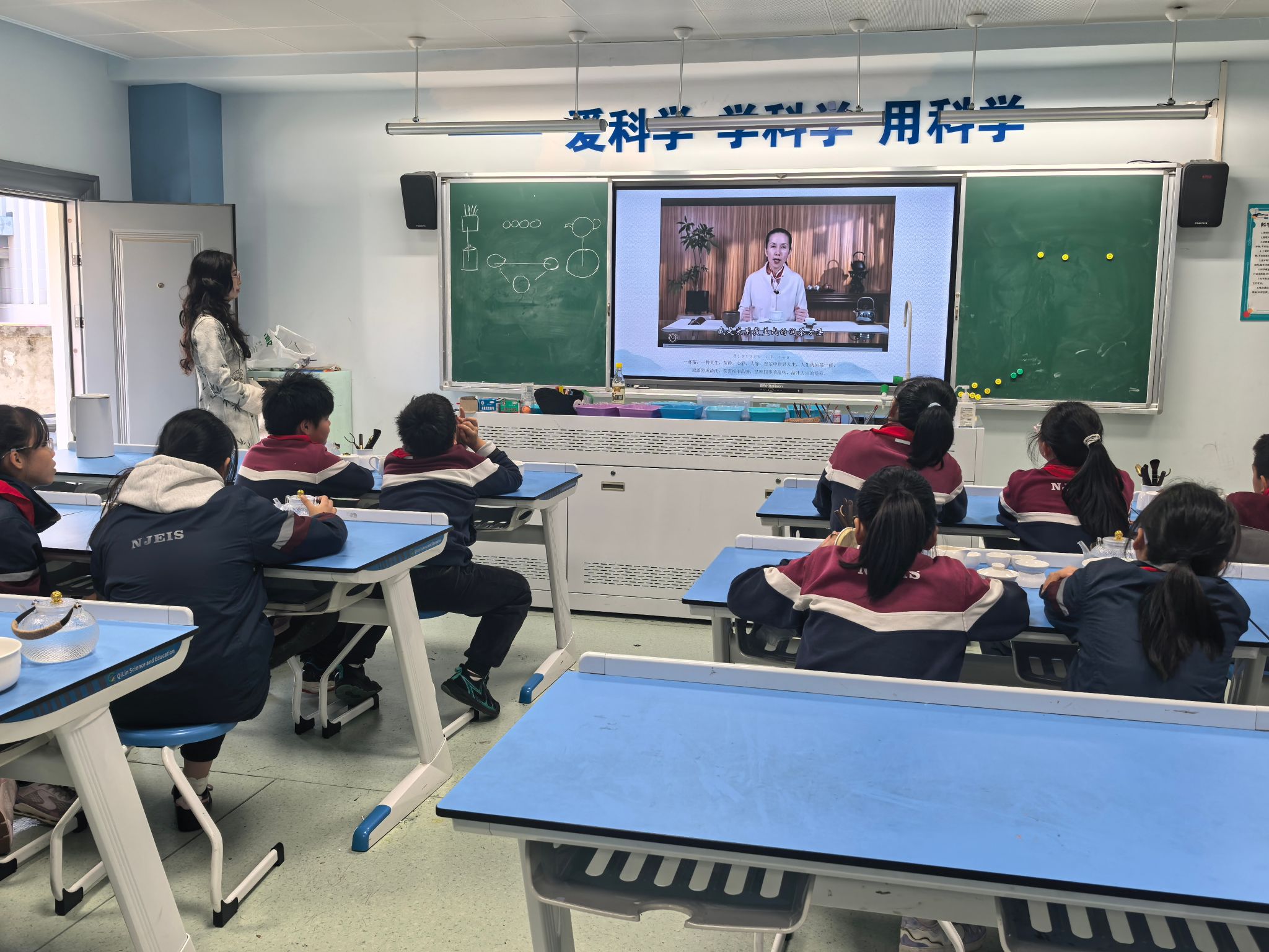 课堂伊始,大学生志愿者通过实物展示与示意图讲解,带孩子们认识盖碗“三才杯” 的构造及公道杯、茶滤等配套茶具的用途,细致传授茶具摆放规范。核心教学环节,志愿者精准拆解绿茶冲泡要点,明确5g用茶量、85℃适宜水温与15s冲泡时间,通过教学视频演示“温杯、投茶、注水、分茶”等八大流程,让孩子们快速掌握关键技巧。
