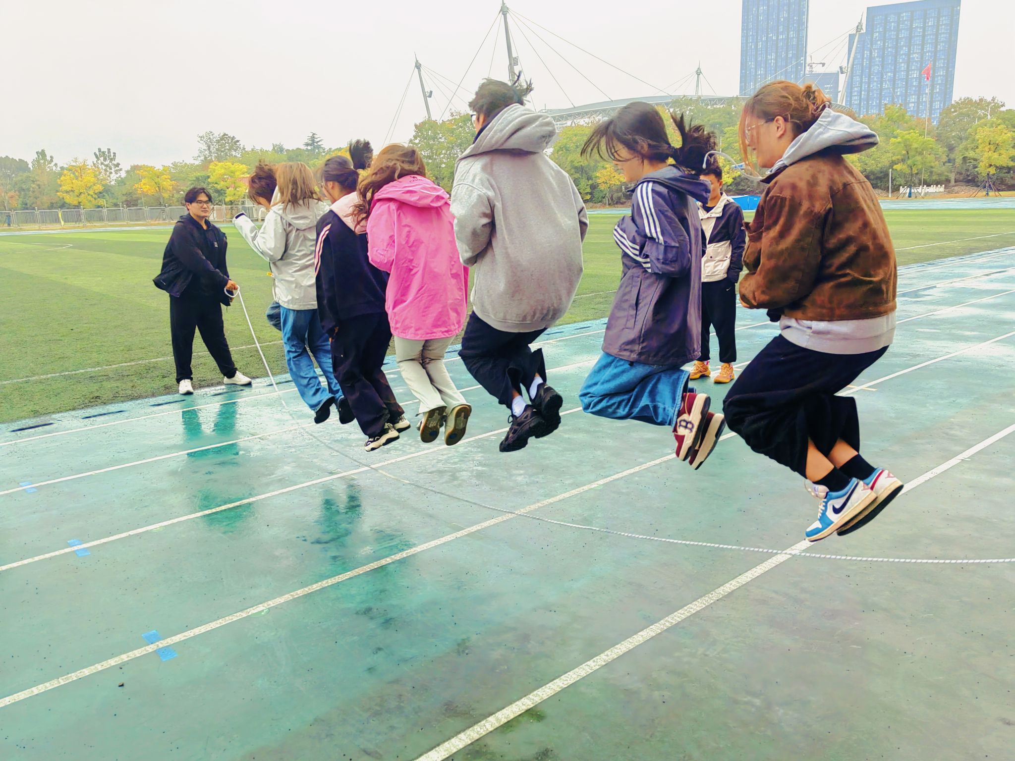 活动伊始,“集体跳大绳”项目率先点燃现场气氛,队员们配合默契,展现出良好的团队协作能力。随后的“蒙眼互打”环节更是妙趣横生,将活动推向高潮。在精彩的竞技间隙,文艺部同学献上动人歌声,为活动现场增添了轻松愉悦的氛围。接下来的“竞跃方格”项目中,队员们展开智慧与运气的较量。最后进行的“浑身牛劲”环节,在弹力绳的牵引下展开力量与策略的比拼。