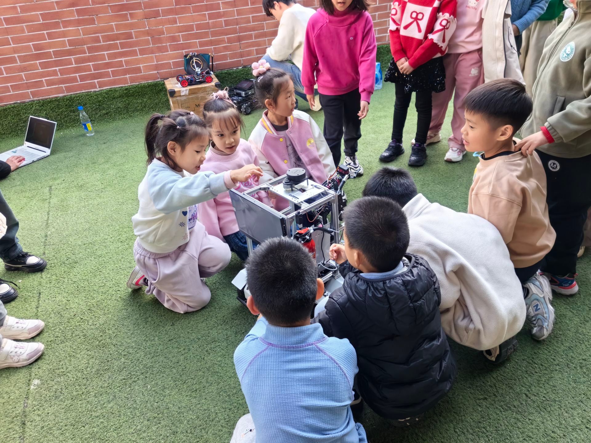 高校智慧“零距离”,王赛雨以生动讲解开启科技之旅,巧用马达小船、球形齿轮、机械臂、篮球机器人等趣味科技模型导入主题,用直观可见的动态演示拆解机械原理,将抽象科技知识转化为鲜活场景,快速吸引学生注意力,激发探索兴趣。随后,消防巡检机器人、竞速机器人、智能侦察机器人车依次亮相,通过模拟实操、互动体验展现科技魅力,团队成员精心指导学生调试指令、操作运行,在沉浸式体验中传递科创理念。现场学生踊跃提问、积极参与,在欢声笑语中触摸科技、萌发创新意识。我院“行走的科创课堂”将前沿科技转化为孩子们看得见、摸得着的互动体验,架起课本知识与现实应用的桥梁,让科学思维的种子在孩子们心中“生根发芽”。