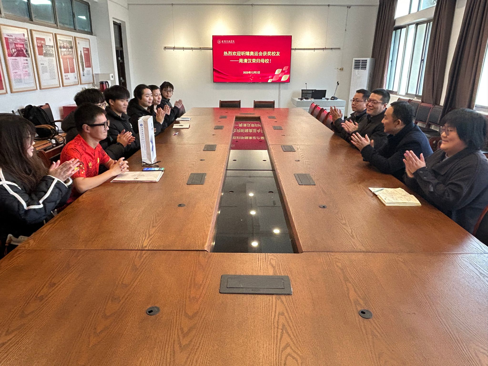 随后艺术学院在6306会议室举行优秀校友座谈会,邀请2017级环境设计专业周清汉同学与学院党委书记、院长匡才远,党委副书记鲍锐,副院长黄向群,全体辅导员及学生代表面对面交流,分享其征战第25 届夏季听障奥林匹克运动会的拼搏故事,传递“坚韧逐梦”的精神力量。