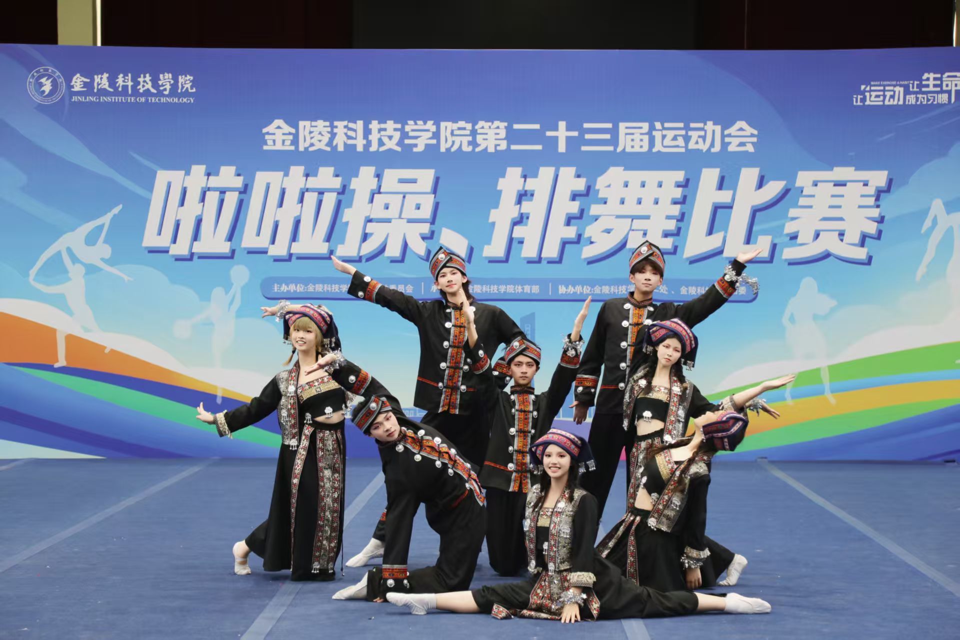 动感音乐刚一响起,材料工程学院啦啦操队员便踩着鼓点跃入场地——利落的旋转带起风,整齐的跳跃震得地板轻响,每一个动作里都裹着少年人的力量。在排舞比赛中,悠扬婉转的《山歌好比春江水》旋律缓缓流淌,大家身着融合壮族元素与青春活力的队服,踩着乐曲的节奏轻盈舞动,把现场的掌声一波波推向高处,加油声、喝彩声裹着体育馆里的热气,成了最动听的背景音。