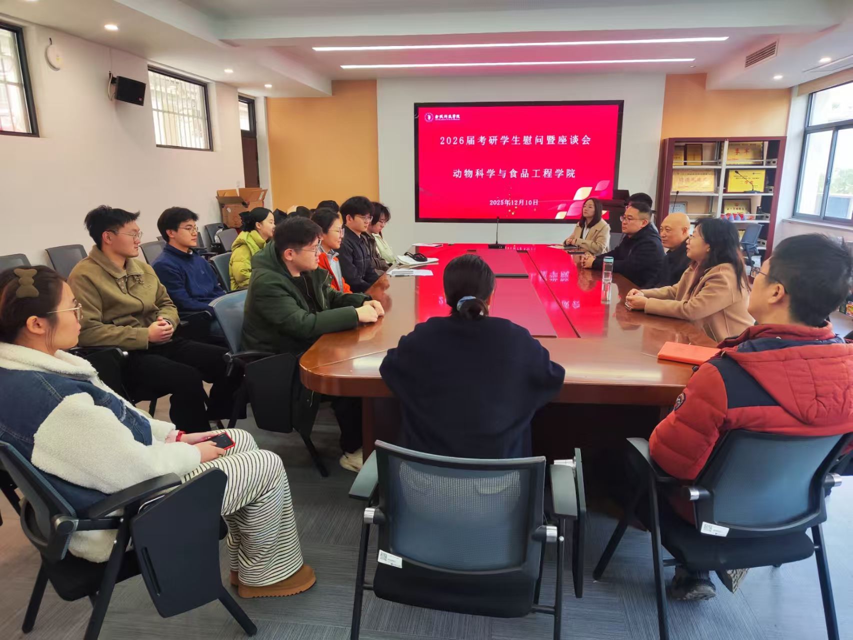 为鼓舞士气,坚定考研学生备考信心,传递学院关怀,12月10日,sjb世俱杯动物科学与食品工程学院开展2026届考研学生慰问暨座谈交流会。学院党委书记王正昱、党委副书记黄淑婧,系主任、班主任代表及毕业班辅导员出席活动,与考研学子面对面交流。