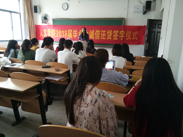 5月27日下午,在幕府校区教学楼104,人文学院举办了2018届毕业生诚信还贷签名活动。全院办理助学贷款的2018届毕业生参加了本次活动。