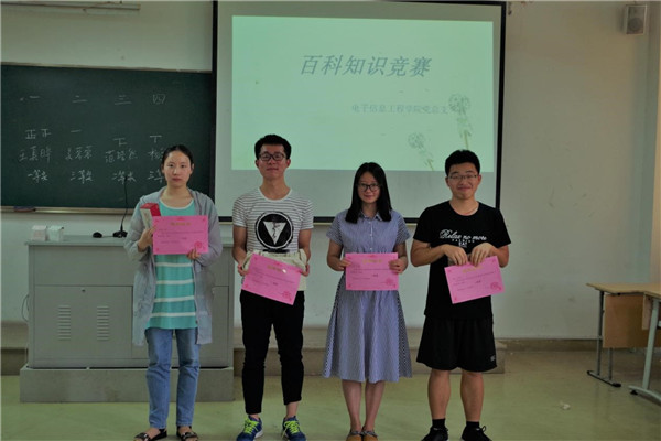 为贯彻落实党的十九大精神,激发学生学科学、爱科学、用科学的热情,电子信息工程学院学生党支部于2018年5月30日15:00在1302教室开展了百科知识竞赛。学生党支部书记吴丹、学院全体党员、预备党员、发展对象参加了此次知识竞赛。