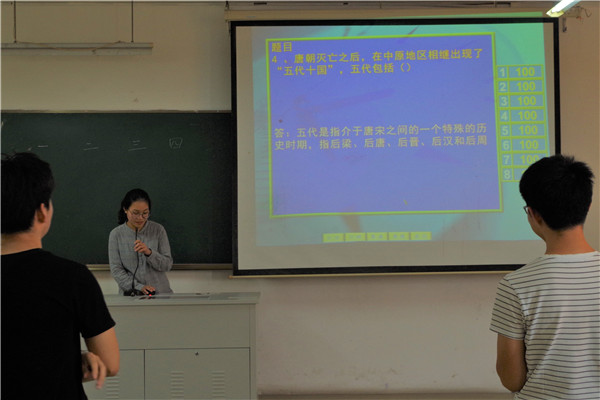 本次竞赛主要分为两部分,即初赛和决赛。比赛内容涵盖十九大、法律、历史、文学等相关知识。13名参赛选手分成4组,每组分别通过打擂台的方式,选出擂主进入决赛环节。决赛环节4名佼佼者进行抢答,答对加分,答错不扣分。每位参赛同学事先都做了充足准备,在抢答环节竞争较为激烈,不分伯仲。最后,王真晔获得一等奖,范皓然获得二等奖,吴蓉蓉、杨军获得三等奖。