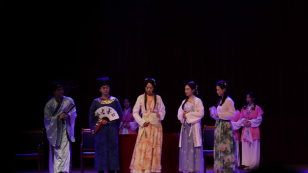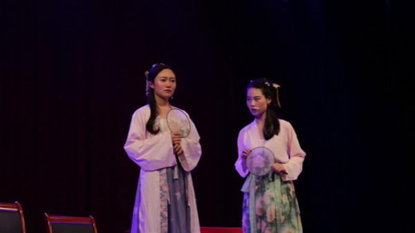 《桃花扇》是一部表现亡国之痛的历史剧,通过描写男女主人公侯朝宗与李香君悲欢离合的爱情故事,以小见大,来反映明末腐朽动乱的社会现实。演员们身着古典的服装依次出场,尽情投入话剧中,将戏中人物的形象表现得淋漓尽致。