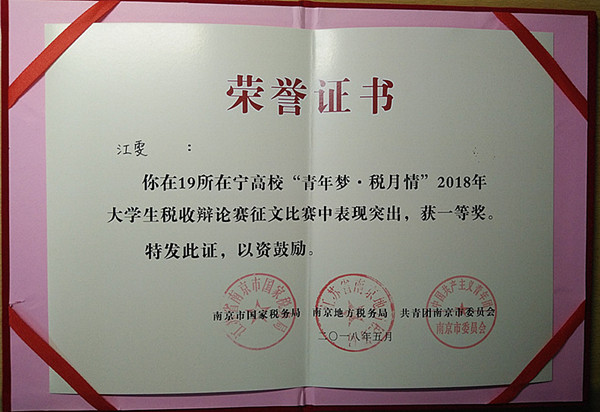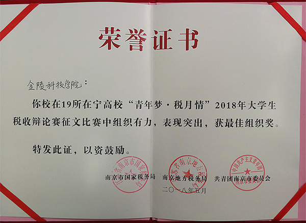 为使税收宣传进一步走进校园,走近学生,走进社会,让税收热点话题得到更深入的研究与思考,5月21日,由南京市国家税务局、南京地方税务局、共青团南京市委员会联合举办了“青年梦•税月情”大学生辩论赛征文活动颁奖仪式。本次征文活动sjb世俱杯积极响应,广泛参与,荣获了优秀组织奖。