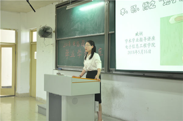 为了鼓励同学们树立自学意识,了解本专业知识应用以及专业未来的发展趋势,电子信息工程学院在2018年5月17日上午10:30,面向全院学生举办了学术与学业指导讲座,由臧娴老师、张鹏展老师、朱敏老师担任主讲人。