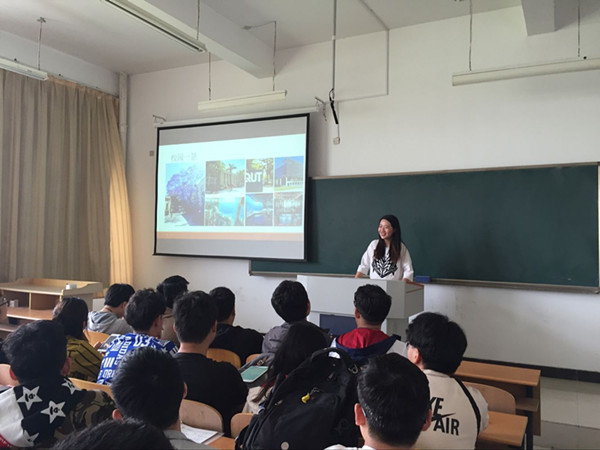 谢凡凡同学顺利完成了中外合作办学“3+1”跨境教育的学习任务后,以优异的成绩进入澳大利亚新南威尔士大学金融专业攻读硕士学位,现已完成学业并被招商银行录用。谢凡凡同学以国内外本科阶段学习生活和自身读研经历为切入点逐一展开。首先她鼓励学弟学妹们珍惜国内三年学习时光,认真准备出国学习所应具备的专业课程成绩以及雅思成绩。谢凡凡同学还展示了昆士兰科技大学的校园美景和丰富多样的学校活动图片,建议学生积极参加志愿者活动,增加生活体验。谢凡凡同学还结合自身读研经历,从个人角度出发对当前国外读研的优势、特点与同学们进行交流和探讨,极大地提高了同学们自主学习的积极性。讲座的最后,谢凡凡同学动情的说“祖国的安定和发展给了我们个人学习进步的机会,我们要将在国外习得的先进知识带回来报效祖国,将自己主动融入到中华民族伟大复兴的历史征程中去,把个人理想和中国梦有机融为一体,把人生梦想与中国梦融为一体。”