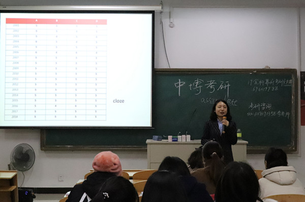 讲座伊始,朱老师首先提醒同学们及时关注报考学校网站,掌握第一手信息,以明确未来复习方向。随后,朱老师从考纲考点入手,分析了近几年英语出题的特点,有针对性地讲解了如何应对及备考策略。除了对英语考点的介绍外,朱老师强调:“考研最重要的是找到适合自己的复习方法,循序渐进,坚持不懈。只有坚持到最后的人,才能微笑到最后,才能取得成功。”朱老师希望同学们能够刻苦认真,扎实打下基础,多阅读课外书籍,为自己未来打拼。