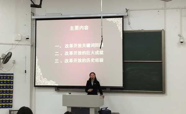 讲座伊始,陶爱萍老师介绍了本次讲座的主要内容:改革开放关键词回顾、改革开放的巨大成就和改革开放的历史经验。紧接着,陶爱萍老师围绕三个主题展开讲座。随后,陶老师播放四十年前的小岗村视频,以《实践是检验真理的唯一标准》文章使同学们深刻认识改革开放的关键词。接着,以多个“第一”介绍了改革开放的历史成就。讲座最后,介绍了改革开放给予我们的经验与教训。同学们认真听讲,全场气氛热烈。