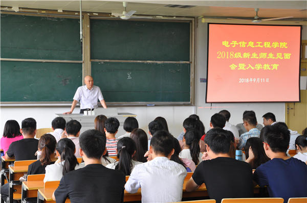 见面会结束后,电子信息工程系主任姜志鹏系老师为新生做了入学教育,分别从学院的院况简介、专业简介和个人建议三个方面,由大到小,由外到内,慢慢深入地为新生进行了基本的专业了解。在对我院的师资情况、科研情况、教研教学情况、实验条件有一个大致了解的基础上,讲解了我院对学生的培养目标,致力于将学生打造成“高级应用型工程技术性人才”,并为此制定具有“行业化”特色的课程设置和电子信息工程专业人才培养方案。因为电子信息工程专业是以服务于电子信息制造业产业的下游应用行业为主的专业,且同时辐射其他相关产业,所以学生的就业方向十分广泛。智能消费设备制造、电子电路制造、专业电子设备制造、工程和技术研究、通用仪器仪表制造、应用软件开发行业、相关设备销售、科技推广和应用等都包含在内。