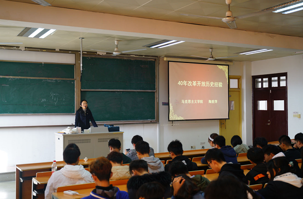 陶老师结合自身感受从改革开放四十年来国家的飞速发展和人们生活方式的改善为出发点,以真人真事讲述了改革开放的故事和新时代中国特色社会主义的故事,生动阐述了改革开放是改变中国命运伟大抉择的观点,陶老师还和在场同学分享了改革开放的历史进程和伟大成就,深入总结了改革开放四十年的重要启示,强调要牢牢坚持习近平新时代中国特色社会主义思想的指导地位,在党的领导下不断将改革开放伟大事业继续推向新高度。陶老师的报告受到师生的一致好评,让在场师生更直观地感受到了中国改革开放四十年以来所取得的巨大成就。