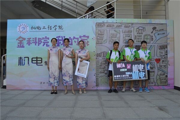 青春在这里飞扬,梦想在机电启航。迎新当天,机电青春梦想邮局为每位新生寄信啦!学院制作的青春梦想信封背景墙迸发出勃勃的青春活力。同时由机电学子亲手制作的“金科逐梦队”机器人在迎新现场也摇曳身姿,举着欢迎牌迎接新生,充分展现了我院专业特色和学生科技成果,吸引新生纷纷驻足观看与拍照。报到现场,学院给每一位新生发放2017-2018年学院学生成果展示宣传册,志愿者为新生热情讲解,让新生在入学之初就能充分感受到机电的独特科创文化,为成为机电学子而感到自豪。辅导员精心制作的新生材料袋温暖贴心,材料袋中包括新生安全须知、新生常见问题、入学安排、医保报销指南、励志书签、金科手绘地图等,让新生感受到了机电大家庭的细心、贴心和暖心。约300位新生结束报到后前往南区食堂西门放置的“金科院,我的家”学生手绘金科地图照片墙前,手举朋友圈模型拍照留念,学院当天将入学纪念照片冲洗过塑后发至每位学生手中,镜头下的他们正微笑着成为新一代“机电人”。学院还在创新实验室挂起了“求真学问,练真本领,机电学院欢迎新同学”的迎新横幅。机电学子迎新说心,与梦想同行,共同唱响新的希望。