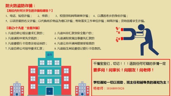 在开学前N天,你们的辅导员杨老师给你们整理了安全指南,发出了老姐姐的深情呐喊,愿单纯的你们可以一直无害下去。防火防盗防诈骗以及滴滴安全出行的小TIPs,漫话安全教育,严肃的安全警示文字与形象生动的动漫相结合,内容形象而生动,只希望你们可以多加防范,多加小心,因为你们的安全牵动着无数人的心,我们爱着你们!