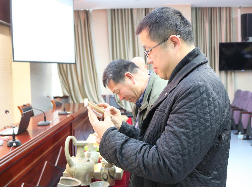 讲座伊始,董老师采用PPT的形式,图文并茂,向同学们更加生动直观地讲解了青瓷知识。他从陶瓷衍生发展讲起,用标本展示的方式,深入浅出的讲解了不同历史时期青瓷的基本特点。为使学生们更深入学习古陶瓷,专委会还带来了部分青瓷残件为学习标本,同学们有序地上台来一同观赏学习了一件件“宝贝”,纷纷感叹青瓷不愧为瓷中之宝,珍奇名贵!