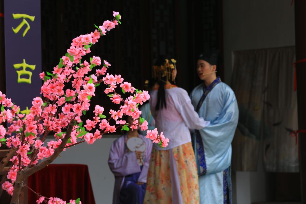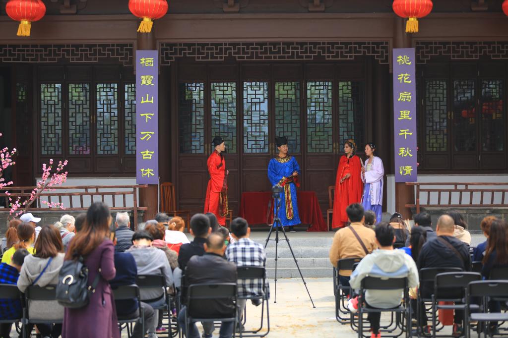 在栖霞寺广场的长廊下,一大早剧社的老师和同学们早已做好准备,为前来踏春的游客演绎“桃花”故事与传奇。该剧曾在2016年首届“山·寺·桃花”会上上演,时隔三年,又融入了“栖霞山”、“栖霞寺”的元素,演员们在舞台上惟妙惟肖地演出,将话剧人物形象表现的淋漓尽致,赢得了现场观众阵阵掌声。当天有两百多人次,在观众席观看了演出。