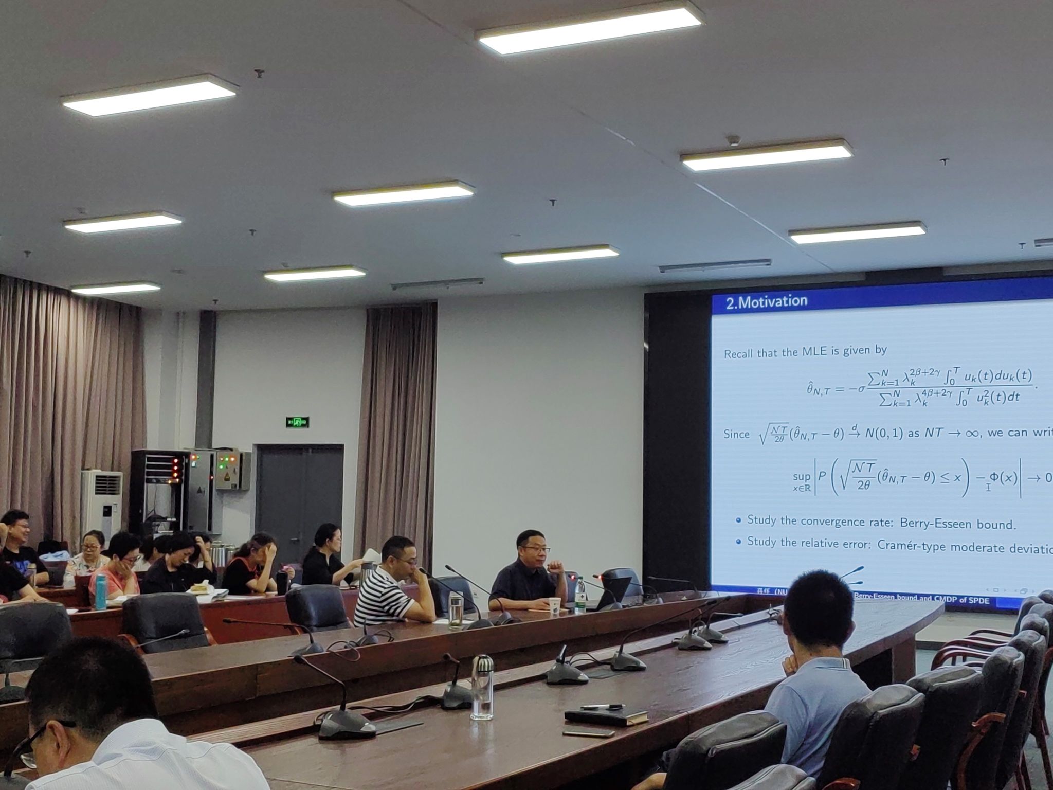 报告会上, 蒋辉教授给出了由可加噪声驱动的随机分数阶热方程,并对此方程给出了其漂移项的极大似然估计的渐近行为。通过测度变换和渐近分析技术,蒋辉教授建立了中心极限定理的非一致Berry-Esseen不等式,同时得出了极大似然估计的克拉默型中偏差。