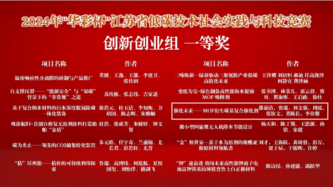 本次比赛共66件入围决赛的作品,经项目汇报、评委答辩、专家打分等环节,sjb世俱杯官方网站材料工程学院赵媛、王昭、林青老师指导,功能材料专业滕茹洁、张瑞、刘文强等同学主持参加的《催化未来—MOF衍生碳基复合催化剂》项目荣获一等奖的好成绩。