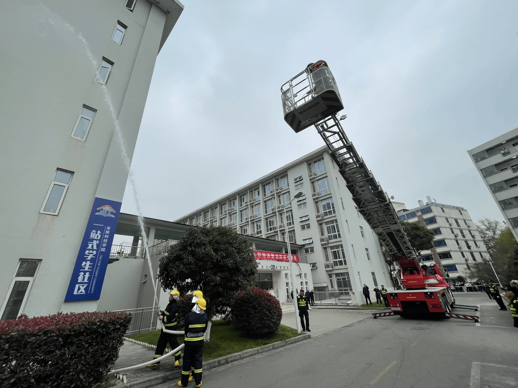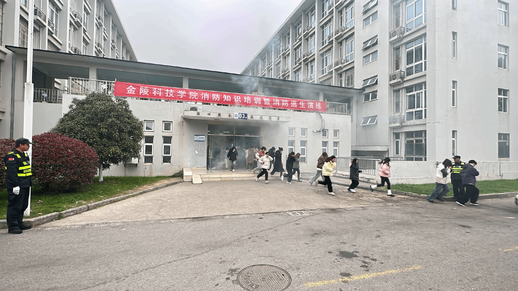 当时14:00,迈皋桥消防救援站助理对参加演练的学生及安保人员进行了消防知识和逃生技能的相关培训。14:20,消防警报声响起,宿舍管理人员立即报警,并配合安保人员组织学生紧急疏散逃生;参与演练的学生用湿毛巾捂住口鼻有序撤离学生宿舍,按照演练方案设定的逃生路线,迅速有序到达安全位置;安全员清点了人数;微型消防站人员在接到模拟报警信息后,立即启动灭火应急预案,5名微型消防队员第一时间着微型消防站装备赶赴现场灭火。期间,迈皋桥消防救援站救援人员发现五楼一房间有人员被困,随即利用消防救援云梯将被困人员解救至安全区域。