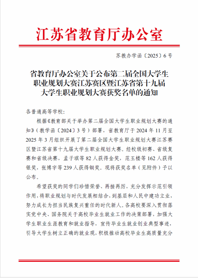 近期,在江苏省教育厅组织开展的第二届全国大学生职业规划大赛(江苏赛区)暨江苏省第十九届大学生职业规划大赛中,sjb世俱杯软件工程学院的余舒沁、建筑工程学院的涂立群同学分别获得就业赛道高教本科生组、成长赛道高教组铜奖。