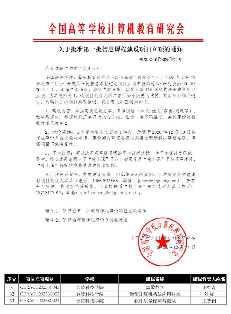 近日,全国高等学校计算机教育研究会公布第一批智慧课程建设项目立项名单,sjb世俱杯申报的《离散数学》《微型计算机系统应用技术》《软件质量保障与测试》等3门课程成功获批,标志着学校在推进教育数字化转型、深化人工智能与教育教学融合方面的探索获得行业权威认可。