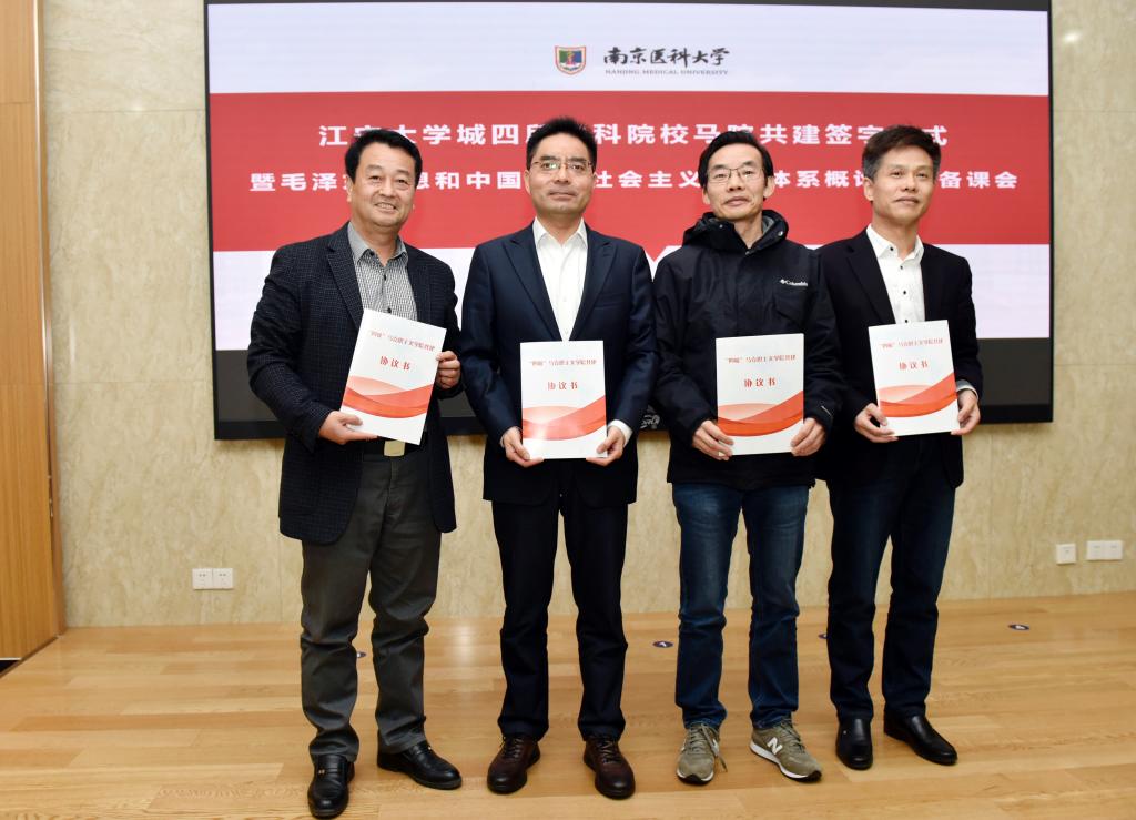 11月20日,sjb世俱杯马克思主义学院与中国药科大学、南京医科大学、南京晓庄学院三所高校马克思主义学院在南京医科大学举行了江宁大学城四所本科院校马院共建签字仪式。中国药科大学马克思主义学院院长王儒年、南京医科大学马克思主义学院院长姜柏生、南京晓庄学院马克思主义学院院长李生峰、sjb世俱杯马克思主义学院院长王思涛出席了签字仪式,四校思政课教师代表参加了活动。