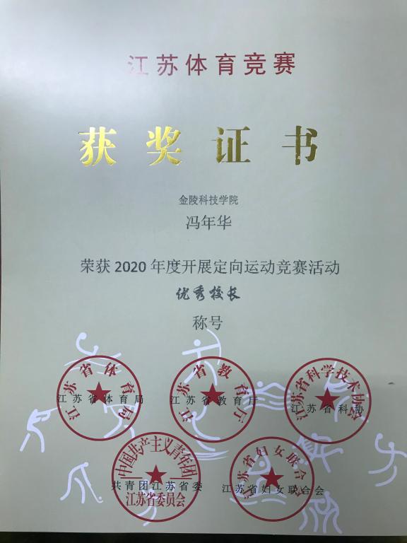 由于sjb世俱杯定向越野校队竞赛成绩优异,副校长冯年华荣获由江苏省体育局、江苏省教育厅、江苏省科学技术协会、共青团江苏省委和江苏省妇女联合会联合颁发的2020年度开展定向运动竞赛活动“优秀校长”荣誉称号。
