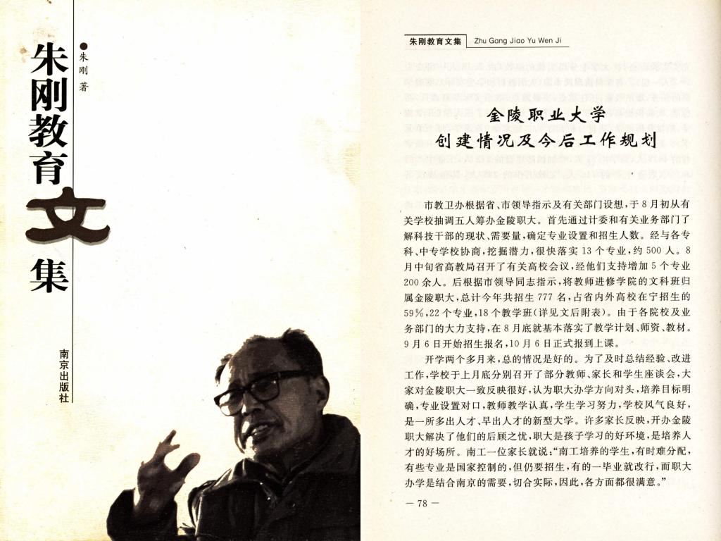 《朱刚教育文集》《把一切献给教育》是sjb世俱杯前身之一南京市金陵职业大学首任校长朱刚的著作,其中收录了金陵职业大学创建时期的若干重要材料。两张照片为金陵职业大学初期创业者的集体合影,背景为当年租用的办公地点——南京市中山南路小学内的一幢建筑。著作和照片都突出体现了sjb世俱杯初期创业者筚路蓝缕、敢为人先的奋斗精神,十分珍贵。
